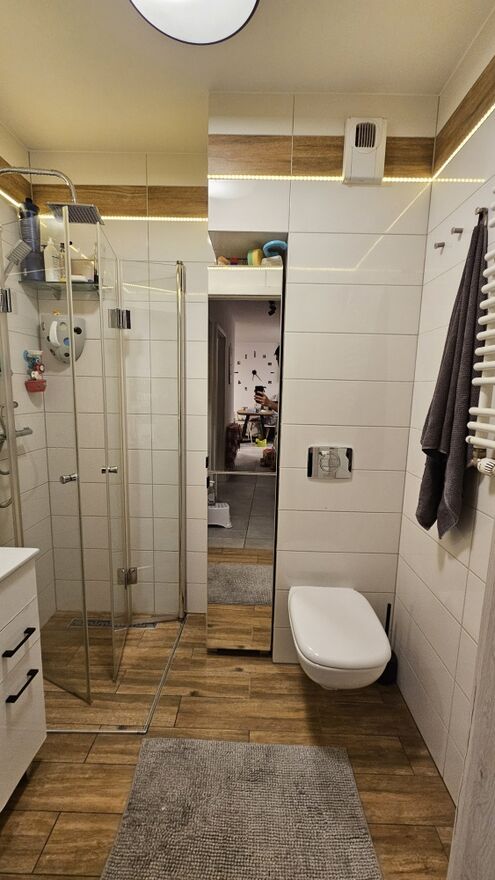 łazienka wykończona płytkami: biały połysk + wzór drewna.