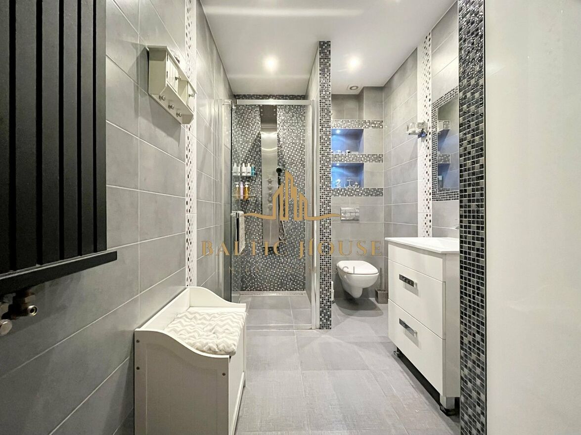 - łazienka z prysznicem i szafą w zabudowie z miejscem na pralkę i suszarkę,