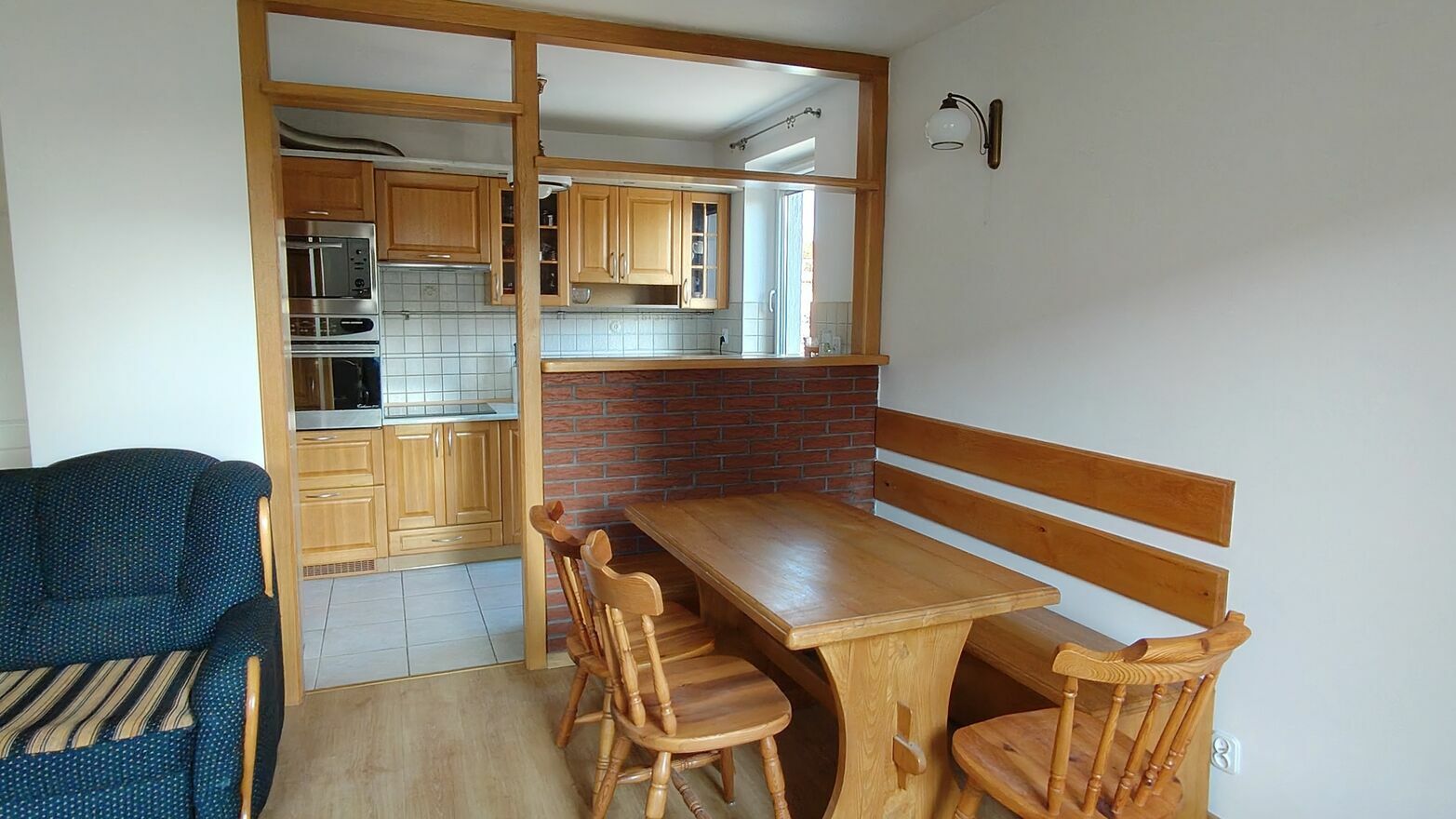 - kuchnia z oknem (7 m²) otwarta na pokój i przedpokój– z zabudową szafek oraz ze sprzętem AGD w bardzo dobrym stanie (zaledwie 3-letnim),