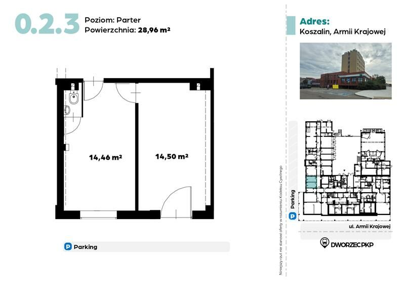 Dwupokojowy lokal usługowy 28,96 m² – elastyczna przestrzeń w centrum KoszalinaPrezentujemy Państwu wyjątkowy lokal usługowy o łącznej powierzchni 28,96 m², składający się z dwóch niezależnych pomieszczeń (14,46 m² oraz 14,50 m²). Lokal znajduje się na parterze atrakcyjnego budynku przy ul. Armii Krajowej 8, z wygodnym wejściem bezpośrednio od parkingu przy ul. Jana z Kolna.
