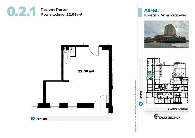 Ścisłe centrum, miejsce doskonale zlokalizowane z każdą częścią Koszalina. PARKING, PARTER, WEJŚCIE OD ULICY.Lokal o powierzchni 22,09 m2, składający się z jednego pomieszczenia oraz miejsca na węzeł sanitarny. Najważniejsze atuty: Bezpośrednie wejście z ulicy i parkingu, co zapewnia wyjątkową wygodę użytkowania i doskonałą ekspozycję.posiada węzeł sanitarny – dostęp do wody i kanalizacji.Światłowód w budynku gwarantuje szybki i stabilny Internet, Dodatkowe połączenie z resztą budynku przez wspólny korytarz. Idealne na działalność: gabinety beauty & wellness (kosmetologia, masaż, manicure)biura podróży, agencje nieruchomości, punkt konsultacyjnymałe biuro IT, księgowość, pracownie projektowebutik, sklep specjalistycznymini punkt gastronomiczny typu food‑to‑go lub kawiarnia Dlaczego warto? Kluczowa lokalizacja: centrum miasta, duży ruch pieszy, zaraz przy dworcuEkspozycja od strony ulicy i parkingu – świetna widoczność i dostępGotowe do adaptacji wnętrze, pod podział funkcji według potrzebNumer oferty: 4403211