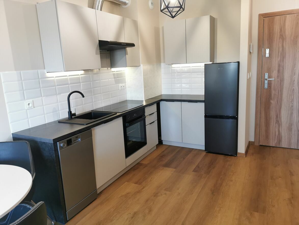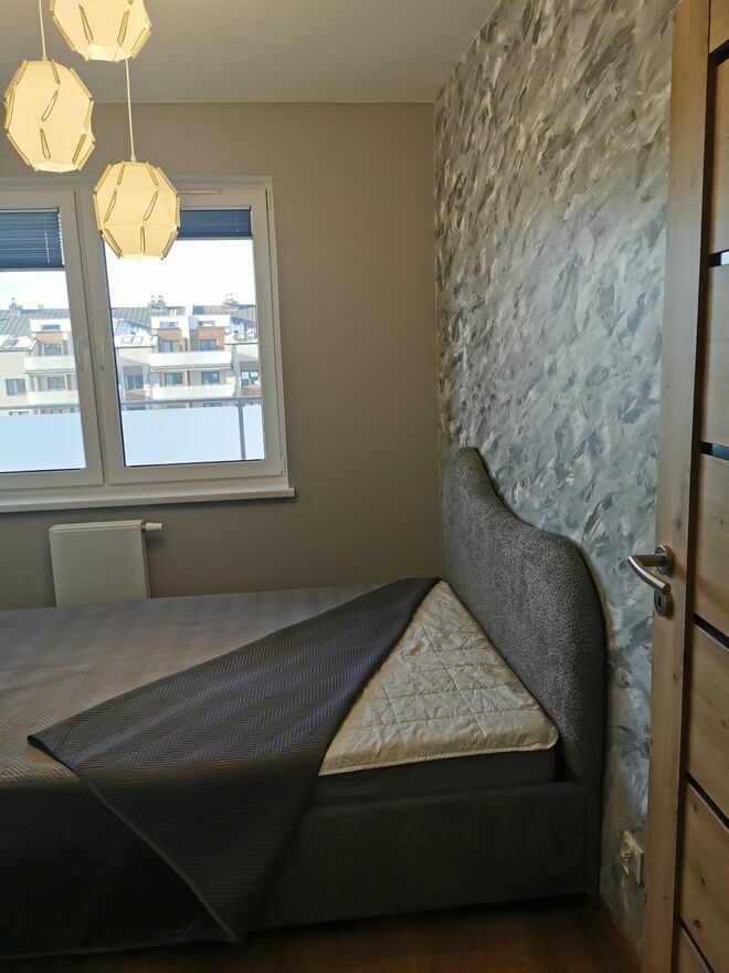 Oferuję do wynajmu bardzo nowoczesne, jasne, mieszkanie 2 pokojowe na czwartym piętrze nowo powstałego Apartamentowca z windą. Całą aranżację wnętrza cechuje wysoka jakość wykończenia. Mieszkanie składa się z salonu z aneksem kuchennym, sypialni i łazienki, posiada również przestronną dużą loggią po zachodniej stronie. Sypialnia zaprojektowana jest w potrójną szafę w zabudowie stolarskiej od podłogi po sufit z ogromem miejsca do przechowywania. Dodatkowym elementem wyposażenia jest podwójny prysznic, czego nie znajdziesz w żadnej innej ofercie.Mieszkanie jest w pełni umeblowane i wyposażone we wszystkie potrzebne sprzęty.
