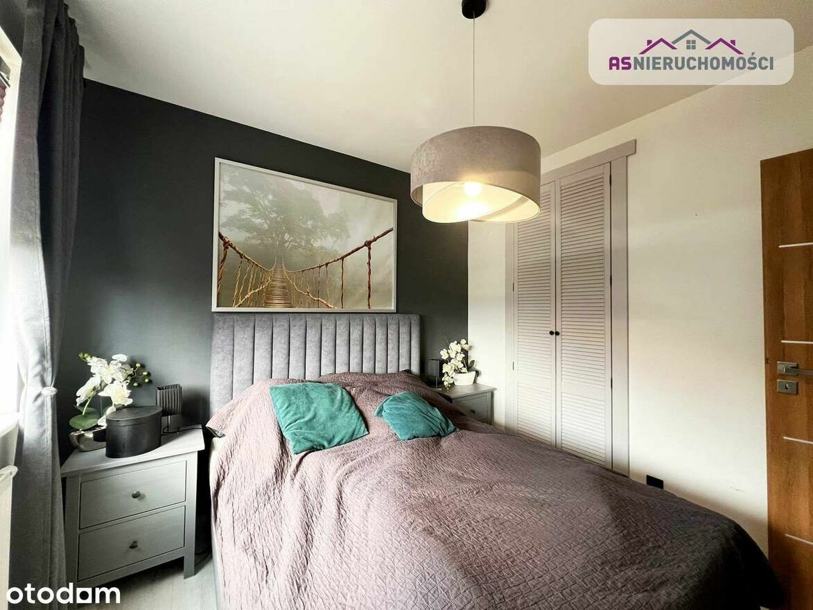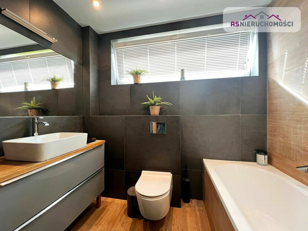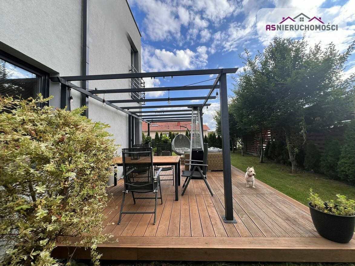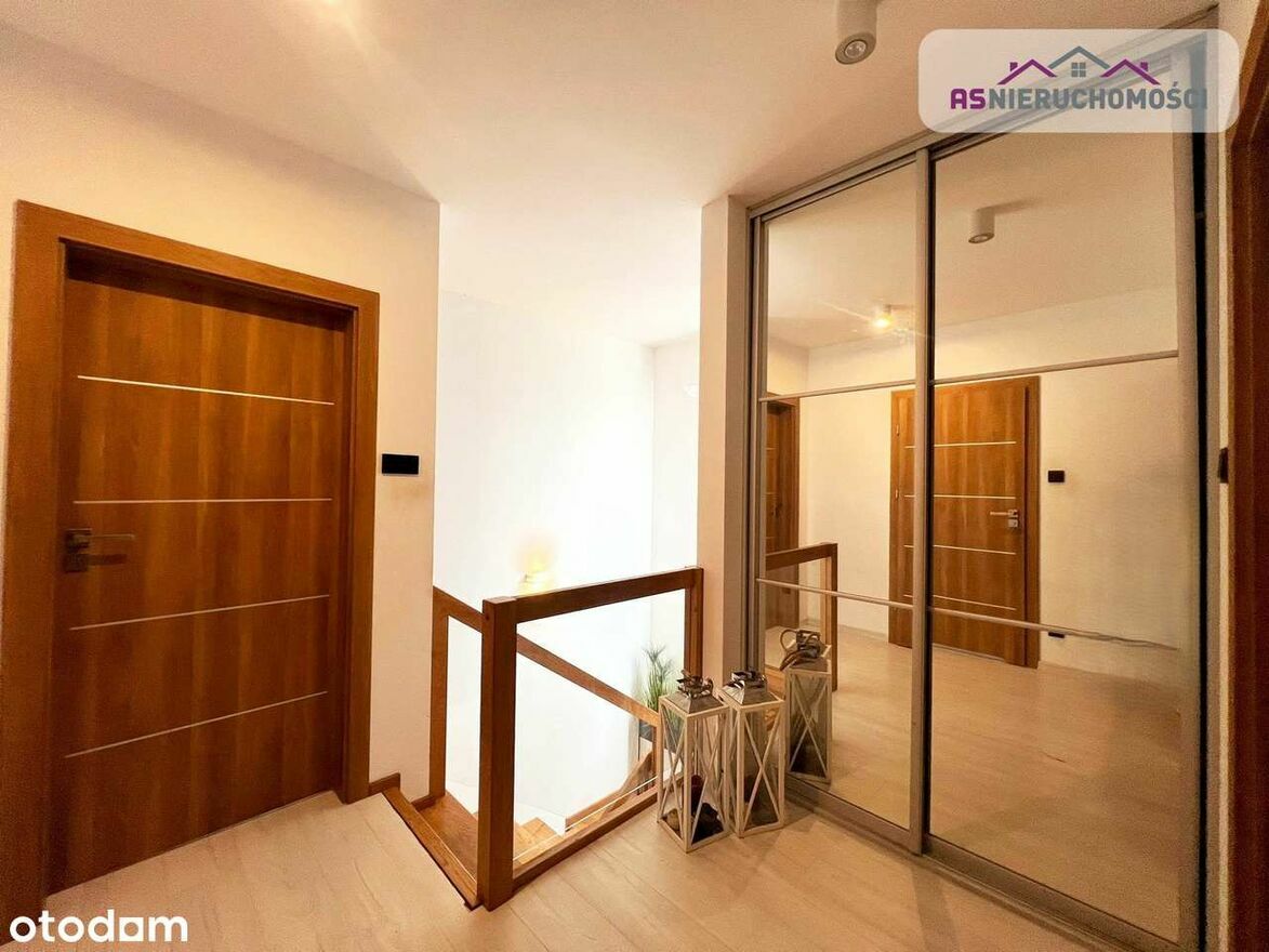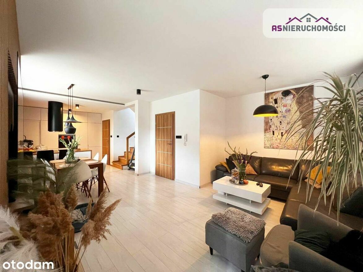 Nieruchomość ciepła, ustawna i bardzo słoneczna. Wnętrza urządzone według najnowszym trendów. Pomysłowo zagospodarowana przestrzeń. Katalogowa, niezwykle elegancka łazienka (z oknem). W dużym, przestronnym salonie wygospodarowane miejsce na stół z krzesłami, gdzie wspólnie, rodzinnie można delektować się posiłkami. Z salonu wyjście na pięknie zagospodarowany taras, z którego jest widok na ogród oraz na otaczającą zieleń. Na piętro prowadzą eleganckie schody dębowe z efektownym przeszkleniem. Nowoczesna stolarka wewnętrzna. Dom ogrzewany piecem gazowym, na parterze oraz w łazience na piętrze ogrzewanie gazowe. Ciepła woda również jest zasilana z tego pieca. Dodatkowo zamontowana klimatyzacja. Teren ogrodzony z automatyczną bramą, przed budynkiem miejsca postojowe. Na działce liczne pięknie do siebie pasujące nasadzenia (tuje, drzewa ozdobne i kilka innych). Okna trzyszybowe. Nieruchomość gotowa do zamieszkania bez ponoszenia kosztów związanych z jego remontem. Istnieje możliwość pozostawienia umeblowania ( szczegóły do doprecyzowania ze Sprzedającą).